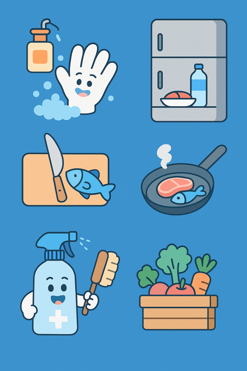 식재료는 흐르는 물에 깨끗이 씻고, 조리기구(칼, 도마 등)는 뜨거운 물이나 전용 세정제를 이용해 세척 및 소독하는 것이 좋습니다. 냉장고 손잡이, 조리대 등 손이 자주 닿는 곳도 주기적으로 청소해줘야 합니다.