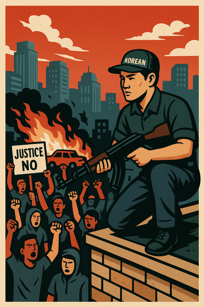당시 LA 폭동은 흑인 남성 로드니 킹의 경찰 폭행 사건을 계기로 일어났습니다. 그러나 경찰력이 부족했던 한인타운은 무방비 상태로 방치되었고, 그 틈을 타 수많은 상점들이 약탈과 방화의 대상이 되었습니다. 이에 일부 한국 교민들은 자구책으로 무장하여 옥상에서 자경단을 조직하고, 상점을 지키기 위해 행동에 나서게 됩니다.